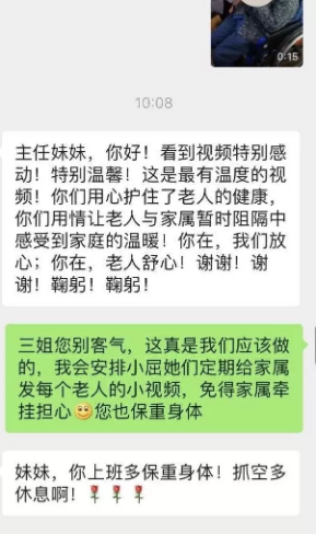 自老年公寓封閉后,公寓的工作人員便與老人家屬們進行了一對一的電話溝通,通過微信,視頻等方式,向家屬們詳細介紹和展示了當前公寓內的各種防控措施,以及護理員照料老人的服務細節(jié),以打消家屬們的顧慮,慢慢的一些家屬從不配合到理解,最終變成了支持。