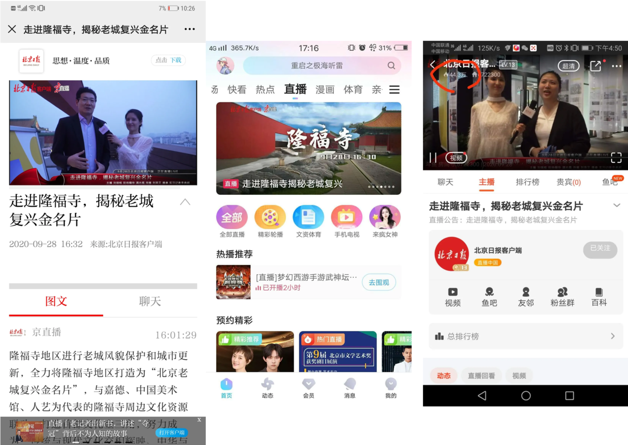 此次直播在北京日報客戶端京直播,北京日報及北京晚報微博直播,北京日報旗下的頭條、百家號、抖音直播、快手直播、斗魚直播,以及聯(lián)合新浪新聞客戶端、優(yōu)酷、長安街知事微博、北京日報百家號、都市現(xiàn)場微博、中搜搜悅、YY直播、KK直播等十余個視頻直播平臺播出,截至目前,總播放量已超過215萬次。直播內(nèi)容全程“高能”,收獲大批網(wǎng)友的關注和點贊。