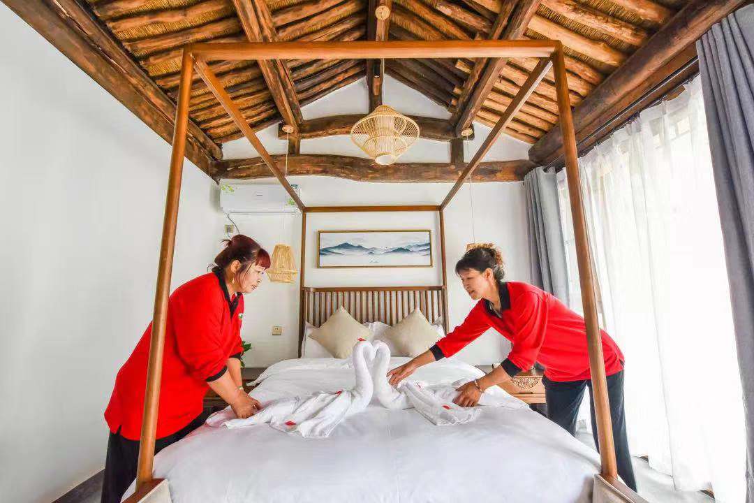 剛才提到的孫大姐,現(xiàn)在如愿地有了穩(wěn)定的工作——創(chuàng)藝鄉(xiāng)居精品民宿管家,經(jīng)過培訓(xùn),她已經(jīng)可以在5分鐘內(nèi)換好床單、被罩、枕芯所有床品,還會把毛巾疊出栩栩如生的小動物。她說,以前總覺得自己低人一頭,現(xiàn)在有了穩(wěn)定工作送到咱家門口,有了份工作,收入不僅翻了倍,而且活的更有價值和尊嚴了。