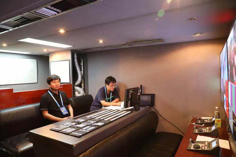 最終播放前,水晶石視頻制作負責(zé)人在轉(zhuǎn)播車內(nèi)審片