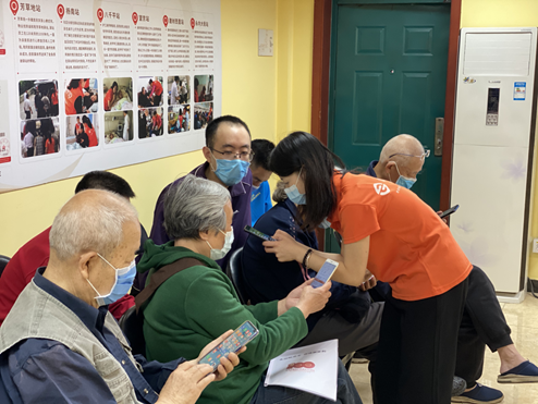 養(yǎng)老驛站黨員幫助社區(qū)老人學(xué)習(xí)手機(jī)軟件使用方法