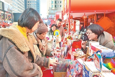 2月12日,市民和游客在隆福寺新春市集前選購文創(chuàng)產(chǎn)品。