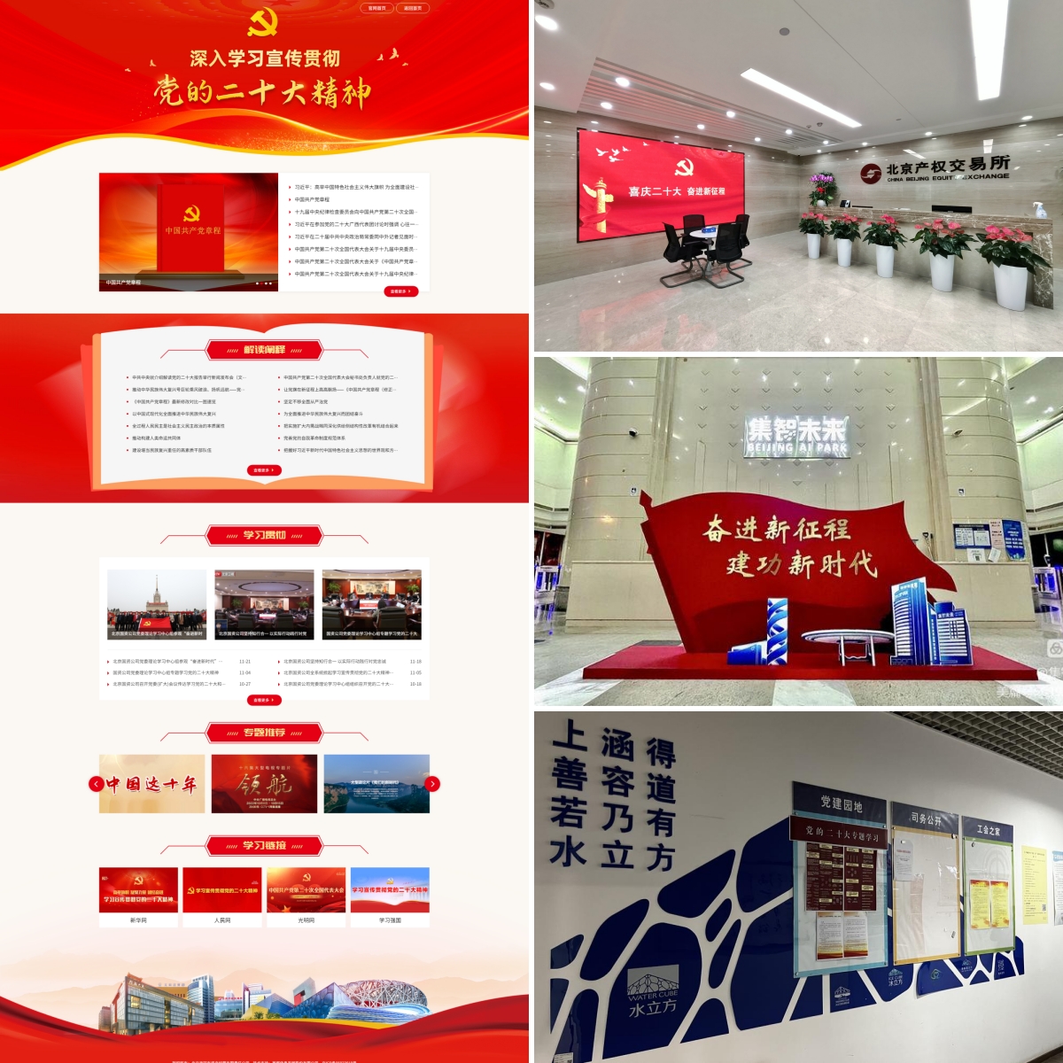 五是聚焦營造氛圍帶動學。公司黨委充分利用公司官網(wǎng)、微信公眾號、OA辦公平臺、國資通APP等宣傳陣地,設計推出“學習宣傳貫徹黨的二十大精神”專題頁面和專欄,及時推送權威學習內容,生動展示各級黨組織和廣大黨員學習貫徹黨的二十大精神的情況。北京產權交易所黨委、國家體育場公司黨委等在公司門戶網(wǎng)站、宣傳展示屏、辦公場所宣傳欄等宣傳陣地布置展示學習黨的二十大精神的宣傳內容,積極營造“喜慶二十大,奮進新征程”的熱烈氛圍。國家游泳中心公司黨總支充分利用辦公區(qū)黨建展板打造黨的二十大專題學習“微陣地”,圖文并茂地展示了黨的二十大報告等內容。集智未來公司黨支部在園區(qū)大廳設置“奮進新征程 建功新時代”主題立體展板,成為園區(qū)企業(yè)支部活動“網(wǎng)紅”打卡點。北京再擔保公司黨總支、國苑公司黨支部等通過黨支部微信群、公司黨建微信公眾號推送黨的二十大精神學習資料,發(fā)布黨組織學習動態(tài),推動黨的二十大精神學習走深走實。