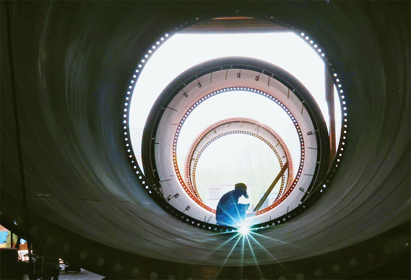2023年一季度,我國國內(nèi)生產(chǎn)總值同比增長4.5%,國民經(jīng)濟(jì)開局良好,為實現(xiàn)全年發(fā)展目標(biāo)奠定了基礎(chǔ),注入了信心。圖為2023年4月18日,工人在江蘇連云港經(jīng)濟(jì)技術(shù)開發(fā)區(qū)一家公司內(nèi)加工組裝風(fēng)電塔筒。 中新社發(fā) 耿玉和/攝