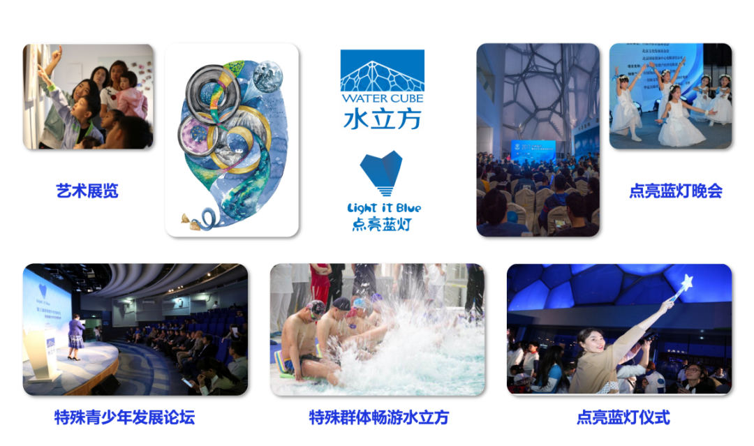 水立方自2011年起開始致力于倡導對自閉癥譜系障礙群體的關愛活動。十年來,水立方通過每年在4月2日這一天“點亮藍燈”持續(xù)為自閉癥譜系障礙群體發(fā)聲,與專業(yè)機構協(xié)作,通過發(fā)起特殊青少年發(fā)展論壇、開放公益參觀游覽、舉辦特殊兒童藝術展覽、開展對特殊群體的公益游泳培訓等多種線下活動,用實際行動表達對自閉癥譜系障礙群體的關愛,并提供切實可行的幫助。