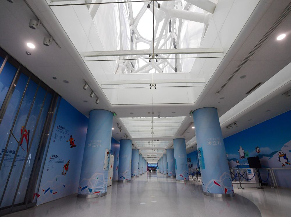 28日,在國家游泳中心波瀾不驚的泳池旁,記者聆聽了水立方變身冰立方背后的故事。