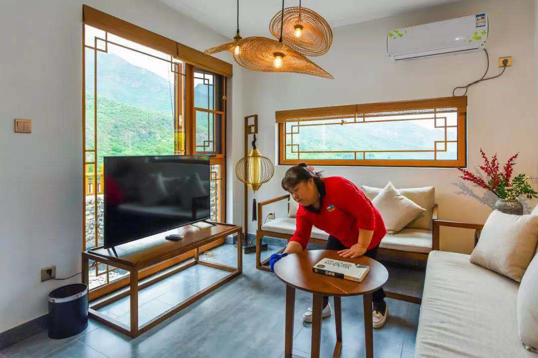 剛才提到的孫大姐,現(xiàn)在如愿地有了穩(wěn)定的工作——創(chuàng)藝鄉(xiāng)居精品民宿管家,經(jīng)過培訓,她已經(jīng)可以在5分鐘內換好床單、被罩、枕芯所有床品,還會把毛巾疊出栩栩如生的小動物。她說,以前總覺得自己低人一頭,現(xiàn)在有了穩(wěn)定工作送到咱家門口,有了份工作,收入不僅翻了倍,而且活的更有價值和尊嚴了。