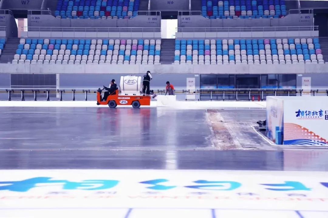 今年1月初,中外制冰團隊在國際制冰師馬克帶領下首次制出速度滑冰賽道,之后為迎接4月初舉辦的“相約北京”冰上項目測試活動,按照冬奧標準進行二次制冰。