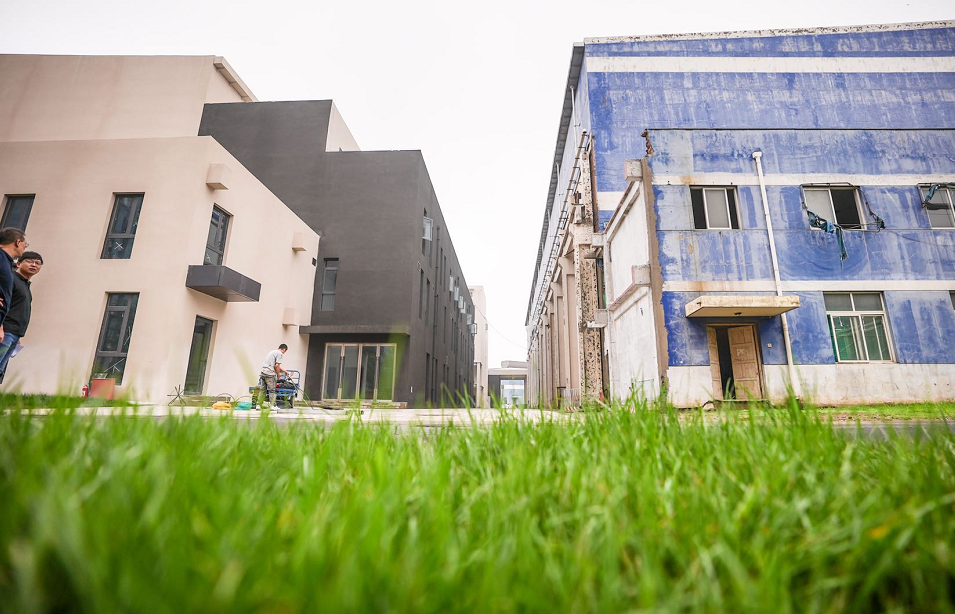 經(jīng)過景觀綠化,曾經(jīng)的工業(yè)老廠區(qū)如今草木蔥蘢,充滿生機活力。經(jīng)過大半年的改造,靠近大門口的一棟老廠房已經(jīng)變成淺黑、米白色調(diào)的現(xiàn)代化辦公樓,與另一棟即將改造的藍白色調(diào)的老廠房形成強烈對比。