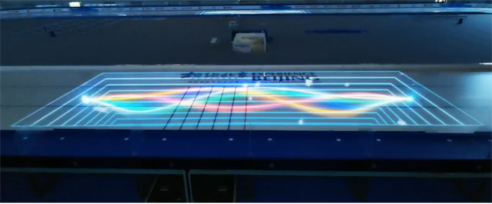本次比賽中體育展示團(tuán)隊(duì)在視頻制作和賽場投影中高質(zhì)量完成了速滑測試賽總片頭、速滑屏幕主視覺、頒獎儀式動態(tài)畫面,以及裸眼3D視效呈現(xiàn)的冰面投影展示。數(shù)字內(nèi)容圍繞速度、熱情、動感、冰雪、速滑館等中國元素,介紹賽事及運(yùn)動員信息,展現(xiàn)速度滑冰及運(yùn)動員的魅力,通過炫酷特效打造極具震撼的視覺沖擊力,激發(fā)觀眾對于后續(xù)比賽的期待和憧憬,在測試賽中更好地展示中國文化。