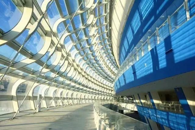 曲面幕墻所使用的玻璃,每塊尺寸曲面弧度都不相同,全部通過BIM技術(shù)在工廠定制、現(xiàn)場安裝。這種創(chuàng)新型“冰絲帶”狀曲面玻璃幕墻,其設(shè)計靈感來自冰雪運動與速度的結(jié)合,盤旋的“冰絲帶”象征著速度滑冰運動員高速滑進(jìn)時冰刀留下的軌跡,同時22條“冰絲帶”又象征著在2022年舉辦北京冬奧會。