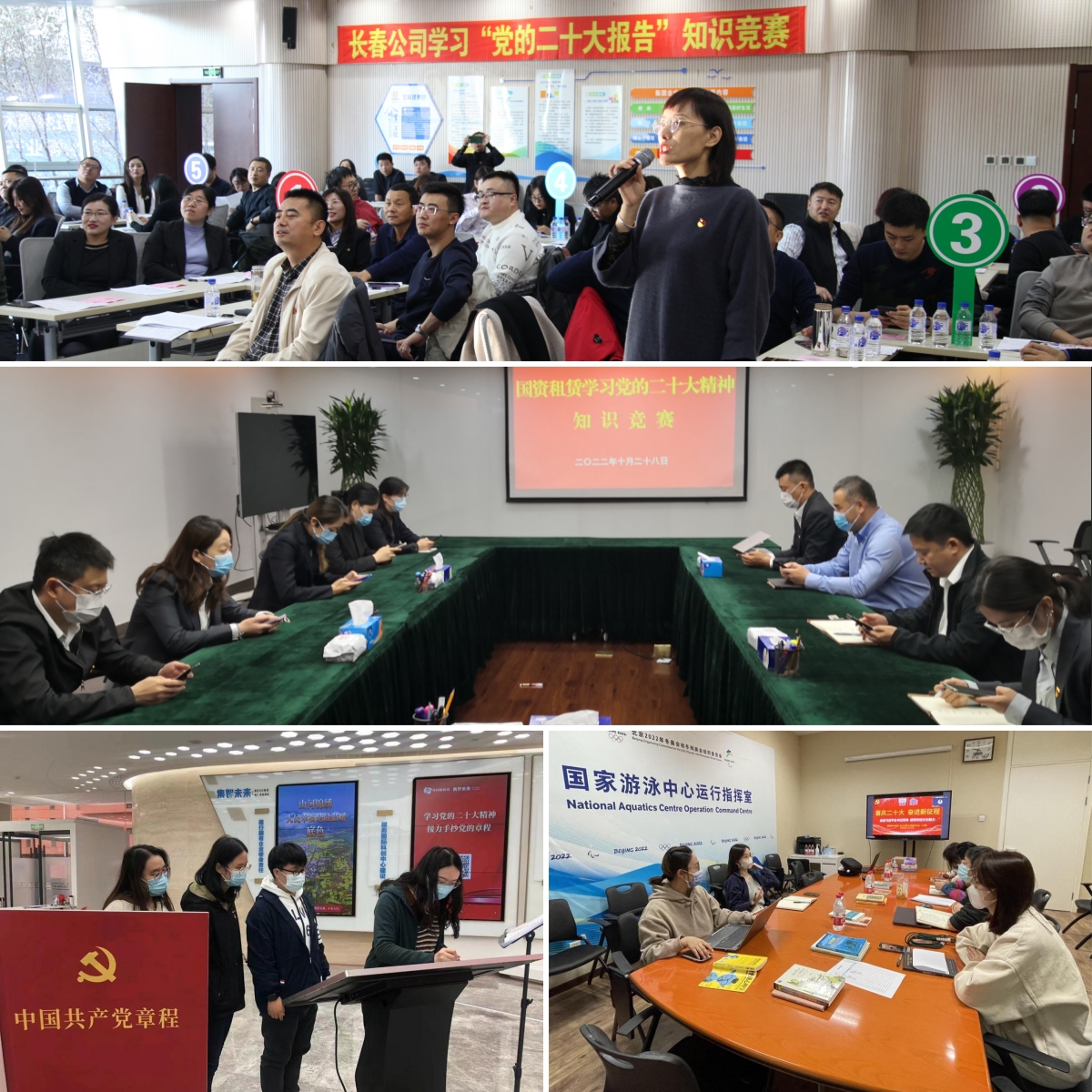 四是聚焦形式創(chuàng)新廣泛學。各基層黨組織充分發(fā)揮企業(yè)職工的主體作用和主觀能動性,創(chuàng)新形式載體,豐富方法手段,不斷增強學習宣傳貫徹黨的二十大精神的吸引力感染力和針對性實效性。國資租賃黨支部、國苑公司黨支部、北科建集團長春公司聯合黨支部等舉辦學習“黨的二十大報告”知識競賽,營造“以賽促學、以學促干、以做踐學”的濃厚學習氛圍。集智未來公司黨支部與屬地街道聯合開展“學習黨的二十大精神,接力手抄黨的章程”主題黨日,園區(qū)及企業(yè)在職黨員、街道黨員干部百余人參加活動。國家游泳中心黨總支組織開展“喜慶二十大 奮進新征程”主題職工閱讀分享活動,結合自身業(yè)務工作實際分享學習黨的二十大報告心得體會。首都信息公司首信科技黨總支將學習黨的創(chuàng)新理論與業(yè)務工作有機結合,與首經貿管理工程學院黨委等黨組織開展“共學新思想、共探新思路、共謀新發(fā)展”學習貫徹黨的二十大精神共建活動,以高質量黨建引領企業(yè)高質量發(fā)展。