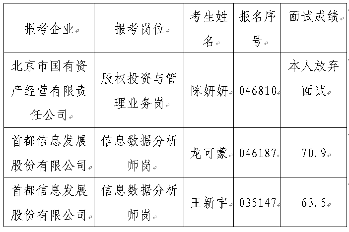 按照《北京市國有資產(chǎn)經(jīng)營有限責任公司2023年度“優(yōu)培計劃”招聘公告》,考生面試成績應達到合格分數(shù)線(75分),進入后續(xù)程序;本次面試, 1名考生放棄面試、2名考生面試未超過合格分數(shù)線,因此沒有人員達到要求,我公司終止2023年“優(yōu)培計劃”招聘工作。