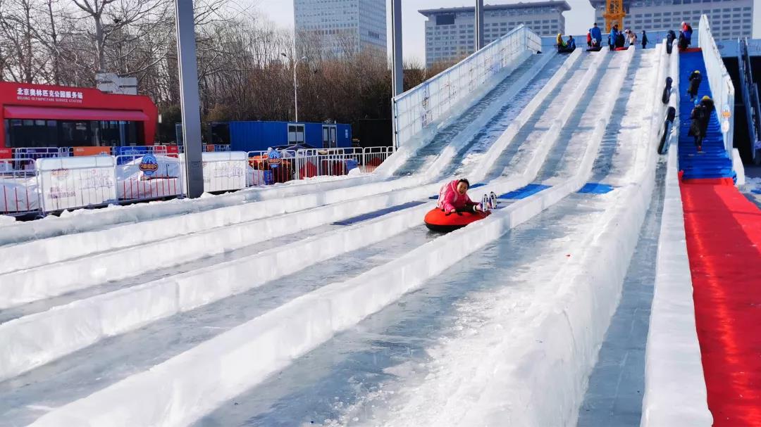 孩子們?cè)趹c典廣場(chǎng)體驗(yàn)飛天大滑道和冰爬犁帶來(lái)的樂趣;