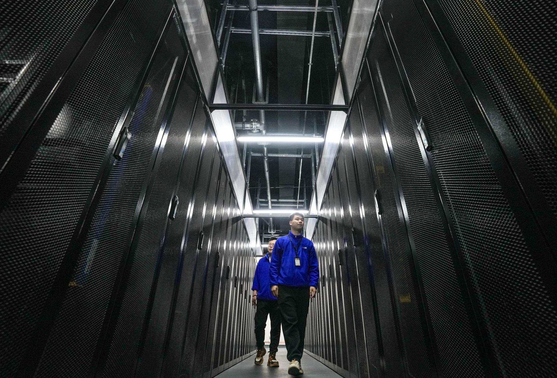 北京數(shù)字經(jīng)濟(jì)算力中心內(nèi),工作人員在查看中心各項(xiàng)運(yùn)轉(zhuǎn)數(shù)據(jù)。